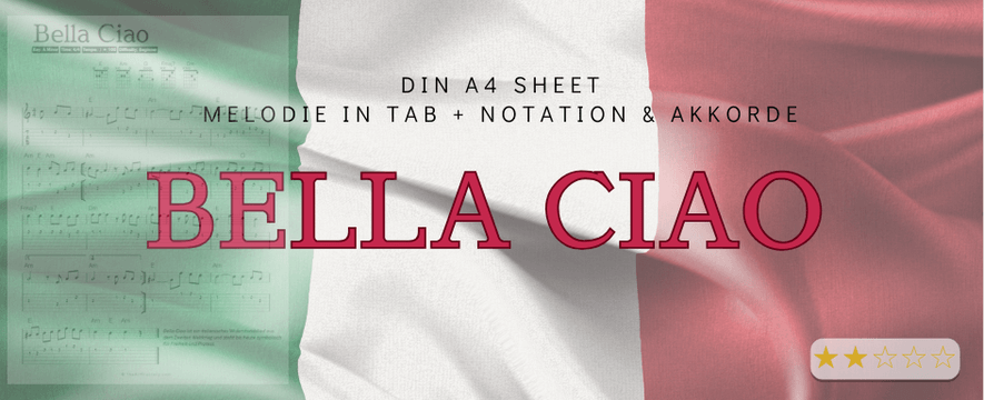Kompaktes Lead Sheet zu Bella Ciao für Gitarre: Melodie in Standardnotation + Tabulatur, Akkordsymbole, klare Form und gut lesbares Layout auf einer DIN-A4-Seite. Ideal zum Üben, Unterrichten oder für Performances. Sofort-Download, druckfertig.